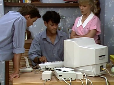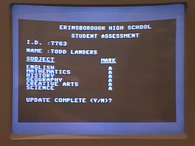 Josh uses a Commodore 64C and a modem to break into the school's computer system and change Todd's grades.