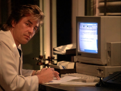 Crockett uses an Amiga 1000 to work on his case files.