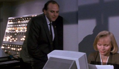The team inspect video of Sheridan's murders in a computer room equipped with FSQ-7 panels.