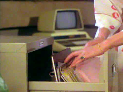 Purdy searches a filing cabinet for evidence and there's a Commodore PET in the same office.